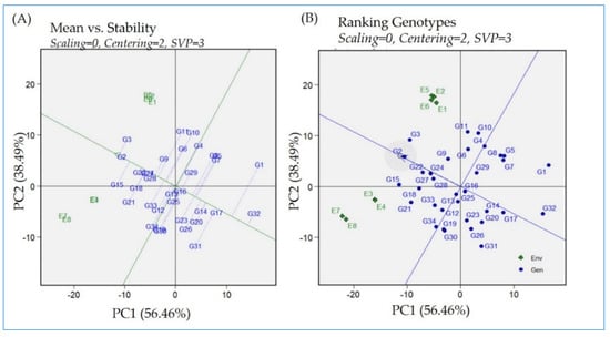 To quantify the magnitude of the GEI in the current investigation, the GEI principal components (PCs) were assessed. GEI was partitioned into seven PCs (Table 1). The first two significant IPCs (PC 1 and PC 2) accounted for approximately 96.9% of the interaction between the E and G. This indicates that these two PCAs were sufficient to present the GEI complex patterns. Consequently, all the interaction information could be speculated by plotting these two PCs. Our findings provide proofing for the results of several earlier investigations obtained by others that support the idea that the first two IPCs of the AMMI model are the most important during quantifying GEI [14,34,35,36,37].