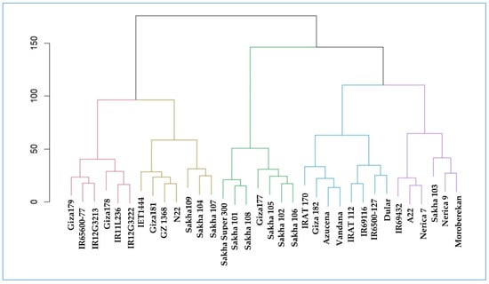 Hierarchical dendrogram classifying the 34 rice genotypes based on their ranks for GY and stability statistics conducted via Ward’s method.