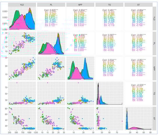 Spearman correlation coefficients for the yield, and other studied yield-related traits. Scatterplots of each trait’s pair of numeric variables are situated in the left part of the figure. Variable distribution is drawn on the diagonal. YLD: yield; PL: panicle length (cm); NPP: number of panicles per plant; TG: thousand grain weight (g); and ST: sterility (%). These traits were recorded for the tested genotypes grown in the four locations for the two consecutive years, 2021 and 2022 (E1 and E2 = Sakha; E3 and E4 = Alexandria; E5 and E6 = Gemmiza; E7 and E8 = Kharga oasis). * p ≤ 0.05, ** p ≤ 0.01, *** p ≤ 0.001.