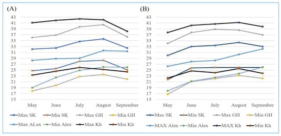 The trials were carried out over two consecutive growing seasons, 2021 and 2022. The temperature data for the four locations over the two years were acquired from https://weather.com/ (accessed on 3 December 2022), while the humidity data were extracted from the NASA POWER project for agricultural needs (https://power.larc.nasa.gov/ (accessed on 1 June 2023)).