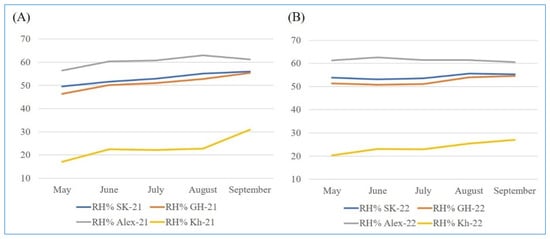 The monthly average of relative humidity (%) at the four locations during 2021 (A) and 2022 (B) rice seasons.