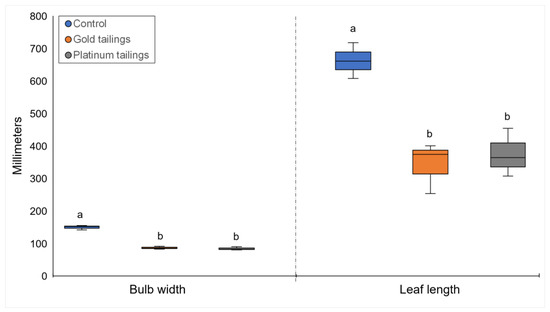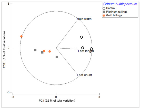 The bulb width, leaf count, and leaf length were evaluated individually in univariate one-way permutational multivariate analysis of variance (Permanova) designs, given the non-normality of the data (Shapiro–Wilk’s, p < 0.05). The factor was the “soil treatment” (fixed, three levels: control soil, gold tailings, and platinum tailings). A PCA with the same variables and factors was performed for the visualization of possible groupings and main variables.
