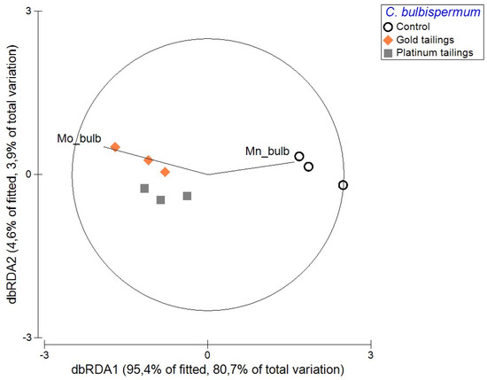 Arsenic, Cd, Co, Cr, Cu, Hg, Mn, Mo, Ni, Pb, Sr, and Zn concentrations in the roots, bulbs, and leaves were compared between plants from the different treatments in uni- and multivariate analyses. A distance-based linear model (distLM) was performed from a Euclidean-distance matrix with the developmental variables from the study plants. Firstly, the trace elements in the different organs were used as predictive variables to assess the influence of PTMs on plant development. A dbRDA was performed to investigate the relationship between metal concentrations and plant organ development. Secondly, the element concentrations in the plant organs were used in a PCA, in search for the main elements (i.e., those with higher correlation with the principal components) as possible drivers of the distribution of the data. Thereafter, the soil treatment factor was tested for differences in each main trace element concentration, in the different plant organs. This was carried out in a univariate two-way Permanova design with “soil contamination” (fixed, three levels: control, gold tailings, and platinum tailings) and “plant organ” (fixed, three levels: roots, bulbs, and leaves) as factors. Finally, the bioaccumulation factors [55] between the roots and the soil were calculated for each of the main elements.