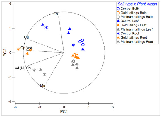 Principal component (PC) analysis with the main PTMs (Cd, Co, Cu, Mo, and Zn) as vectors associated with concentrations in plant organs across the treatments. Elements within brackets are highly correlated (r > 0.9), with the main element listed before the brackets.