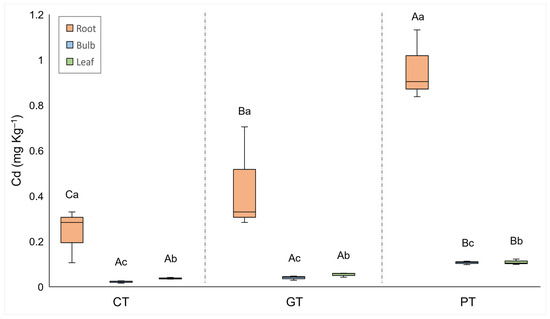 Median, quartiles, and range of Cd concentrations in different plant organs. Treatments: CT = control, GT = gold tailings, and PT = platinum tailings. Different capital letters indicate a significant difference among treatments for the same organ (p < 0.05); different small letters indicate a significant difference among organs within the same treatment (p < 0.05).