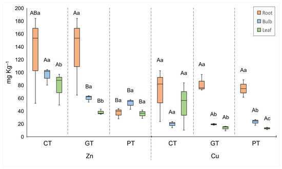Median, quartiles, and range of Zn and Cu concentrations in different plant organs. Treatments: CT = control, GT = gold tailings, and PT = platinum tailings. Different capital letters indicate a significant difference among treatments for the same organ (p < 0.05); different lower-case letters indicate a significant difference among organs within the same treatment (p < 0.05).