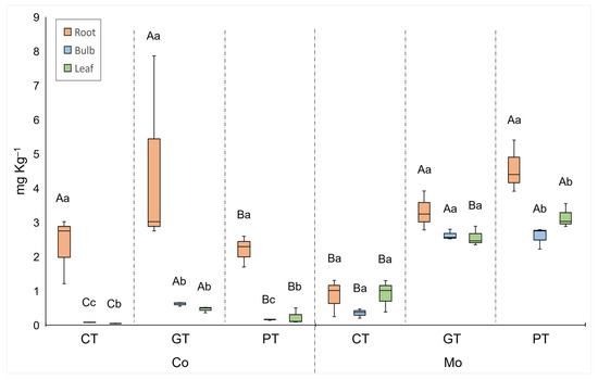 Median, quartiles, and range of Co and Mo concentrations in different plant organs. Treatments: CT = control, GT = gold tailings, and PT = platinum tailings. Different capital letters indicate a significant difference among treatments for the same organ (p < 0.05); different small letters indicate a significant difference among organs within the same treatment (p < 0.05).