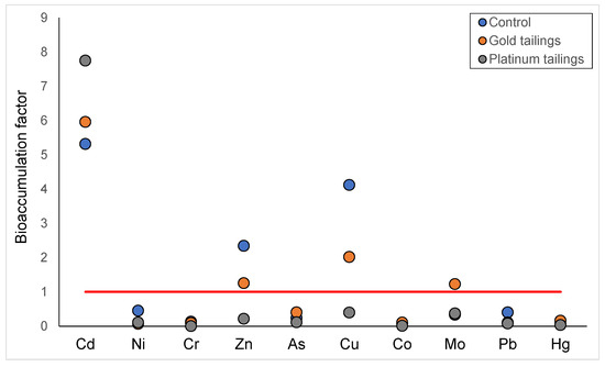 Bioaccumulation factors of PTMs in the roots of C. bulbispermum. The red line indicates the bioaccumulation threshold.