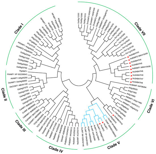 Phylogenetic analysis of HcSABATHs with Arabidopsis and rice SABATHs and other functionally characterized SABATHs. The SABATH members in H. coronarium are labeled with red triangles. The JMT clade is indicated in blue. Ab, Atropa belladonna; Al, Arabidopsis lyrata; Am, Antirrhinum majus; At, Arabidopsis thaliana; Bc, Brassica campestris; Ca, Coffea arabica; Cb, Clarkia breweri; Cc, Coffea canephora; Ce, Cymbidium ensifolium; Cf, C. faberi; Cs, Camellia sinensis; Fv, Fragaria vesca; Na, Nicotiana alata; Ns, N. suaveolens; Ob, Ocimum basilicum; Os, Oryza sativa; Pg, Picea glauca; Ph, Petunia hybrid; Pt, Populus trichocarpa; Sf, Stephanotis floribunda; Sl, Solanum lycopersium; Zm, Zea mays.