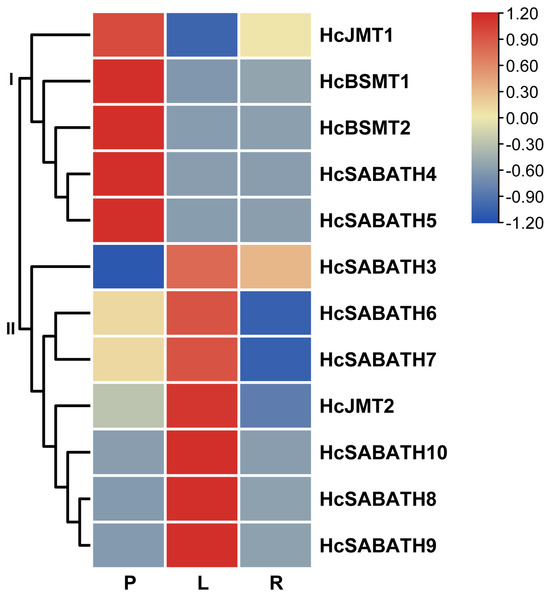 Expression profiles of HcSABATH genes in different tissues based on transcriptomic data. P, petals; L, leaves; R, rhizomes.