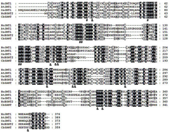 Alignment of amino acid sequences of HcJMT1 with other plant functionally characterized SABATHs. Amino acid residues shaded in black, gray, and light gray represent 100, 80, and 60% conserved identity, respectively. Dashes indicate gaps inserted for optimal alignment. Residues with “#” below indicate SAM binding sites. The amino acids with “&” below indicate substrate binding sites.