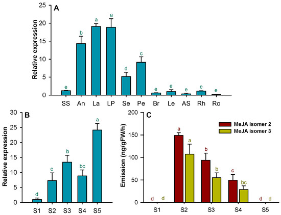 Expression of HcJMT1 and emission of MeJA in H. coronarium. (A) Expression analysis of the HcJMT1 gene in different tissues. SS, styles and stigmas; A, anthers; La, labella; LP, lateral petals; Se, sepals; Pe, pedicels; Br, bracts; Le, leaves; AS, aerial stems; Rh, rhizomes; Ro, roots; (B) Expression analysis of the HcJMT1 gene in petals at different floral developmental stages; (C) Emission of floral MeJA isomers at different flower developmental stages. S1, flower bud stage; S2, full-opening stage; S3, 8 h after full-opening; S4, 16 h after full-opening; S5, senescence stage. Different lowercase letters labelled on bars indicate statistically significant differences at the level of p < 0.05.