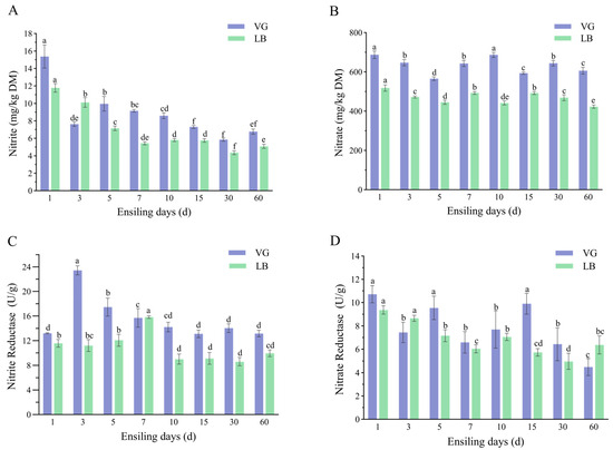 The dynamics of nitrite content, nitrate content, nitrite reductase activity, and nitrate reductase activity during the silage of alfalfa at different growth stages were examined in this study (Figure 1). Both the days of silage fermentation and the growth stage treatments, as well as their interaction, significantly influenced the nitrite content, nitrate content, nitrite reductase activity, and nitrate reductase activity during alfalfa silage (p < 0.05). The nitrite content of both treatment groups generally decreased with increasing fermentation time (Figure 1A). Specifically, the nitrite content of the VG treatment group significantly increased at 5 days of silage fermentation (p < 0.05) but then decreased from 5 to 30 days of fermentation. The nitrate content of the VG treatment group decreased significantly at 5 days of silage fermentation and further decreased at 60 days of fermentation (p < 0.05), being significantly lower than that at 30 days (p < 0.05) (Figure 1B). In the LB treatment group, the nitrite content showed a significant decreasing trend from 1 to 7 days of fermentation (p < 0.05), and was significantly higher at 30 days compared to 60 days of silage fermentation (p < 0.05) (Figure 1A). The nitrate content in the LB treatment group also showed a significant decreasing trend from 1 to 5 days and from 15 to 60 days of fermentation (p < 0.05) (Figure 1B). In terms of enzyme activity, the VG treatment group exhibited a significant decline in nitrite reductase activity from 3 to 15 days of ensiling (p < 0.05) (Figure 1C). The VG treatment group demonstrated significantly higher nitrate reductase activity at 5 days of ensiling compared to 3 days, followed by a significant decrease from 15 to 60 days of ensiling (p < 0.05) (Figure 1D). On the other hand, the LB treatment group showed a significant increase in nitrite reductase activity from 5 to 7 days of ensiling (Figure 1C). Nitrate reductase activity in the LB treatment group exhibited a significant decline from 1 to 7 days of ensiling (p < 0.05), with no significant difference observed from 15 to 60 days (Figure 1D).