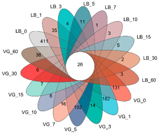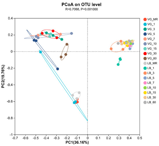 The results of OTU–level principal coordinate analysis (PCoA) depicting the changes in bacterial community diversity within the two treatment groups are depicted in Figure 3. PC1 and PC2 accounted for 36.16% and 19.76% of the observed variations, respectively. Through these analyses, it was determined that the bacterial communities could be classified into six distinct categories. Specifically, the raw materials from both the VG and LB treatment groups exhibited similarities in terms of their assigned categories. The VG treatment group belonged to a single category on day 5, and from day 7 to day 30, it consistently remained within the same category. However, on day 60, the VG treatment group established its own uniquely defined category. Conversely, the LB treatment group formed its distinct cluster on day 1, and this categorization persisted from day 3 to day 60. These intriguing findings underscore the capacity of silage to effectively restore and reconfigure the bacterial community structure within alfalfa silage. In light of these outcomes, it is apparent that the intricate interplay between the treatment groups and the microbial communities orchestrates a dynamic reconstruction process.