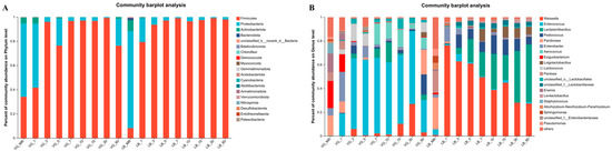 The phylum–level composition of bacteria associated with alfalfa raw materials is presented in Figure 4A. The bacterial community attached to alfalfa raw materials primarily comprises Proteobacteria, Firmicutes, Bacteroidetes, Actinobacteria, and other bacterial phyla. Notably, the proportion of Proteobacteria exceeds 60% across all treatment groups, suggesting their dominant presence. Significant differences in bacterial composition at the phylum level were observed between the two treatments. In the alfalfa raw material of the VG treatment group, the predominant phyla were Proteobacteria, Firmicutes, and Actinobacteria, accounting for 60.67%, 34.08%, and 4.86%, respectively. Conversely, the bacteria attached to the alfalfa raw material of the LB treatment group mainly consisted of Proteobacteria, Actinobacteria, Firmicutes, and Bacteroidetes, representing 80.18%, 8.99%, 8.21%, and 1.94%, respectively.