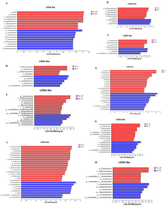 Based on the linear discriminant analysis (LefSe) applied to the relative abundance of silage bacteria (p < 0.05, LDA > 4.0, Figure 5), divergent microbial communities were observed in the forage and silage feed of both the VG treatment group and the LB treatment group. This disparity signifies discrepancies in the microbiota composition of the silage materials and feeds between the two treatment groups. The VG treatment group had Exiguobacterium and Staphylococcus as differential microbial groups in the raw materials, with Exiguobacterium still present after 1 day of ensiling. The LB treatment group had Pseudomonas and Enterococcus as differential microbial groups in the raw materials, with Weissella and Pantoea appearing as differential microbial groups after 1 day of ensiling. After 3 days of fermentation, the VG treatment group exhibited a distinct microbial population of Enterococcus and Lactococcus, whereas the LB treatment group showed a prevalence of Weissella. As the silage fermentation progressed from 5 days up to 60 days, both the VG and LB treatment groups displayed varying compositions of microbial species. The differential bacteria observed in the VG treatment group included Enterococcus, Aerococcus, Pandoraea, Pediococcus, and Lactococcus, while the LB treatment group exhibited Weissella, Lactiplantibacillus, Pediococcus, and Levilactobacillus as the dominant species.