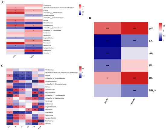 Correlation analysis between nitrite content, nitrate content, and microbial community structure (A) and fermentation characteristics (B) in alfalfa silage, as well as correlation analysis between fermentation quality and microbial community structure (C). LA, lactic acid; AA, acetic acid; PA, propionic acid; BA, butyric acid; NH3–N, ammonia nitrogen. *, 0.01 < p < 0.05; **, 0.001 < p < 0.01; ***, p < 0.001.