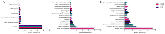 Predicted pathways of bacterial community in alfalfa raw material (VG–MR, LB–MR) and silage on day 60 (VG–60, LB–60). (A) Predicted pathways on level 1; (B) predicted pathways on level 2; (C) predicted pathways on level 3.