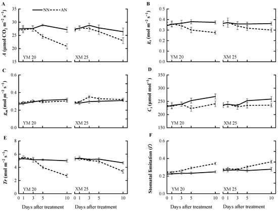 Effects of ammonium stress on (A) net photosynthetic rate (A), (B) stomatal conductance (gs), (C) leaf mesophyll conductance (gm), (D) sub-stomatal CO2 concentration (Ci), (E) transpiration rate (Tr), and (F) stomatal limitation (l) of wheat seedlings at 0, 1, 3, 5, and 10 days after treatment. NN, nitrate treatment; AN, ammonium treatment. YM20, Yangmai20 (NH4+-sensitive); XM25, Xumai25 (NH4+-less sensitive).