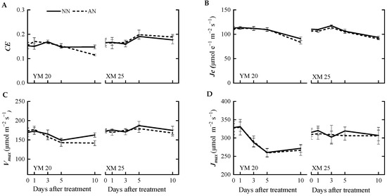 Effects of ammonium stress on the (A) carboxylation efficiency (CE), (B) electron transfer rate (Je), (C) maximum carboxylation rate (Vmax), and (D) the maximum electron transport rate (Jmax,) at 0, 1, 3, 5, and 10 days after treatment NN, nitrate treatment; AN, ammonium treatment. YM20, Yangmai20 (NH4+-sensitive); XM25, Xumai25 (NH4+-less sensitive).