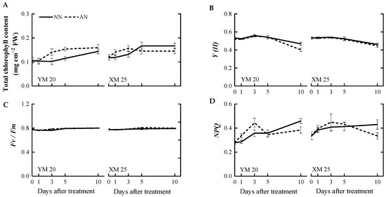 Effects of ammonium stress on (A) total chlorophyll content, (B) actual photochemical efficiency (Y(II)), (C) maximum quantum yield (Fv/Fm), and (D) non-photochemical quenching (NPQ) of wheat seedlings at 0, 1, 3, 5, and 10 days after treatment. NN, nitrate treatment; AN, ammonium treatment. YM20, Yangmai20 (NH4+-sensitive); XM25, Xumai25 (NH4+-less sensitive).