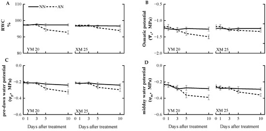 AN treatment adversely impacted the leaf moisture status compared to the NN treatment. At 5 DAT, AN-treated Yangmai20 exhibited significantly reduced relative water content (RWC), pre-dawn water potential (ψp), osmotic potential (ψs), and midday water potential (ψm) compared to NN-treated Yangmai20, while no significant differences were observed between AN- and NN-treated Xumai25. At 10 DAT, the AN-treated plants exhibited a decrease in RWC, ψs, ψp, and ψm, with a more pronounced decrease in Yangmai20 (Figure 4A–D).