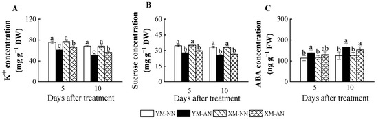 Effects of ammonium stress on (A) K+, (B) sucrose, and (C) ABA concentration of wheat seedlings at 5 and 10 days after treatment. Different letters indicate significant differences (p < 0.05) according to ANOVA. NN, nitrate treatment; AN, ammonium treatment. YM, Yangmai20 (NH4+-sensitive); XM, Xumai25 (NH4+-less sensitive).