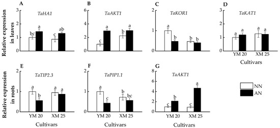 In roots, AN-treated Yangmai20 exhibited significantly lower TaTIP2.3 and TaPIP1.1 expression than NN-treated Yangmai20, while this phenomenon is not observed in Xumai25 (Figure 6E,F). Moreover, the AN-treated plants exhibited higher TaAKT1 expression than NN-treated plants, with significantly higher expression in AN-treated Xumai25 than NN-treated Xumai25 (Figure 6G).