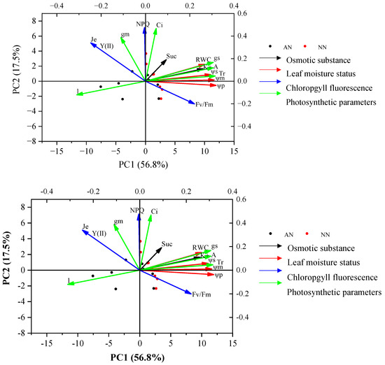 Principal component analysis (PCA) demonstrated that PC1 and PC2 explained 74.3% of the total trait variance for the two wheat cultivars under the two treatments (AN and NN) (Figure 7). The eigenvalue and cumulative contribution of PC1 and PC2 of photosynthetic parameter and physiological traits and their corresponding loading are shown in Supplementary Table S1. PC1 explained 56.8% of total variation and had a positive association with ψm, ψs, ψp, K+, gs, and A, and a negative association with l. Thus, PC1 tended to represent traits like leaf moisture status, osmotic substance, and photosynthetic parameters. Alternatively, PC2 explained 17.5% of the total variation and was positively associated with NPQ and Y(II), representing the chlorophyll fluorescence. These results indicated that photosynthetic traits might be positively related to leaf moisture status and osmotic substance, and were negatively correlated to l.