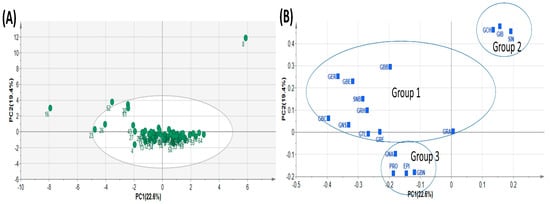- Hamany Djande, C.Y.; Piater, L.A.; Steenkamp, P.A.; Tugizimana, F.; Dubery, I.A. A metabolomics approach and chemometric tools for differentiation of barley cultivars and biomarker discovery. Metabolites 2021, 11, 578. [Google Scholar] [CrossRef] [PubMed]