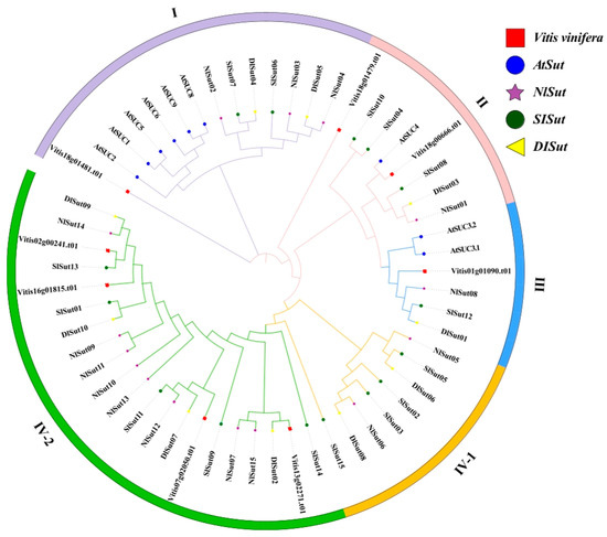 In total, 15, 10, 15, and 8 SUTs were identified from the whole genomes of litchi, longan, rambutan, and grape, respectively, using a combination of SUT family gene sets obtained by HMM prediction and BLAST-based comparison. The SUTs in litchi, longan, and rambutan were termed SlSut, DlSut, and NlSut, respectively (Table S1). A phylogenetic tree was constructed based on all the amino acid sequences identified in these five species to classify them and establish their evolutionary relationship. Since the classification of SUTs from Arabidopsis thaliana was unambiguous, the evolutionary tree was divided into four branches, named I, II, III, IV-1, and IV-2, based on the ID of A. thaliana (Figure 1).