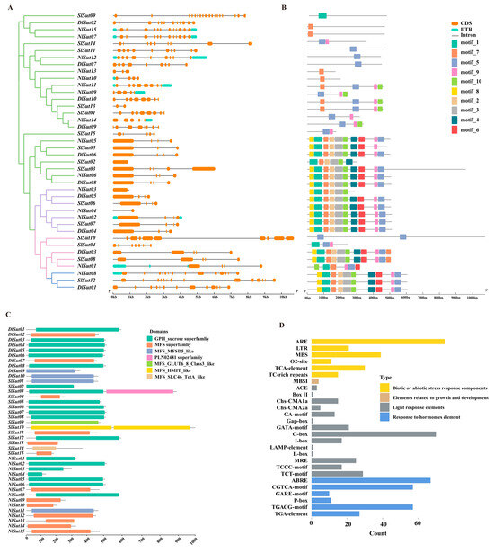 Conserved motifs, structures, and structural domains of SUTs. (A) Phylogenetic trees of the SUTs of litchi, longan, and rambutan were constructed using the NJ method with 2000 bootstrap replicates. (B) Gene structures of SlSut, DlSut, and NlSut; orange boxes indicate CDS, cyan boxes the UTRs, and black lines the introns. (C) Conserved motifs of SlSut, DlSut, and NlSut; the numbers 1–20 and the differently colored boxes indicate the motifs. (D) Cis-acting elements in the promoter regions of SUTs. Statistical histogram of the number of biotic or abiotic stress response components, elements related to growth and development, light response elements, and response to hormone element.
