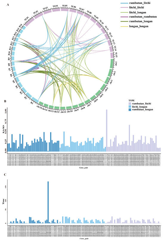 Collinearity analyses of the SUT family genes. (A) Circle plot of orthologous SUT family gene pairs among the three Sapindaceae species. The number on the scale represents the physical location of each chromosome. (B) Ks and Ka/Ks values of orthologous SUT family genes pairs between any two of the three Sapindaceae species. (C) Divergence time estimation of orthologous SUT family gene pairs between any two of the three Sapindaceae species.
