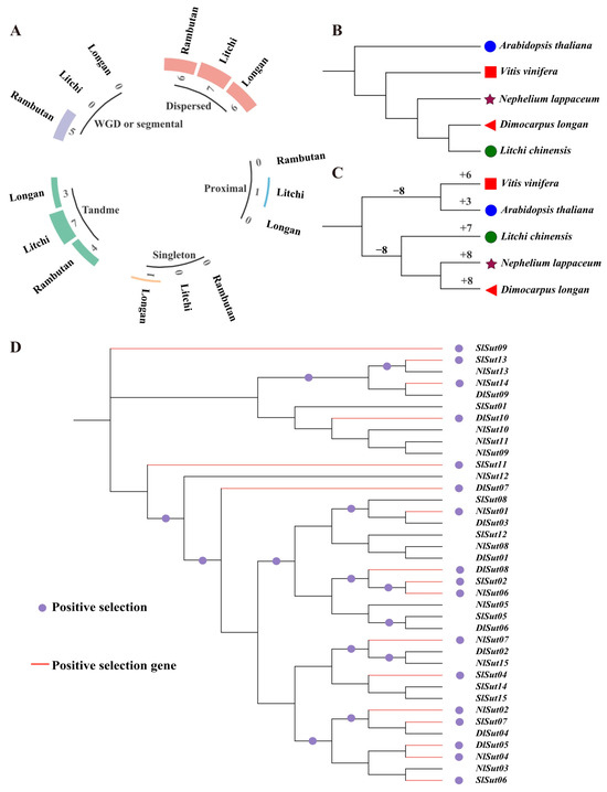 Duplication and positive selection analyses of the SUTs in the three Sapindaceae species. (A) Proportion of duplications in the whole genome and the SUTs. (B) Phylogenetic tree constructed using proteins encoded by the entire genome of the five species: litchi, longan, rambutan, grape, and Arabidopsis. (C) Phylogenetic tree constructed using proteins encoded by the SUTs of the five species: litchi, longan, rambutan, grape, and Arabidopsis. (D) Positive selection analysis of the SUTs, with the red stars representing the positively selected branches. The maximum likelihood (ML) phylogenetic tree was constructed employing PhyML (V3.1) software. The bootstrap values are indicated by the numbers on each branch.