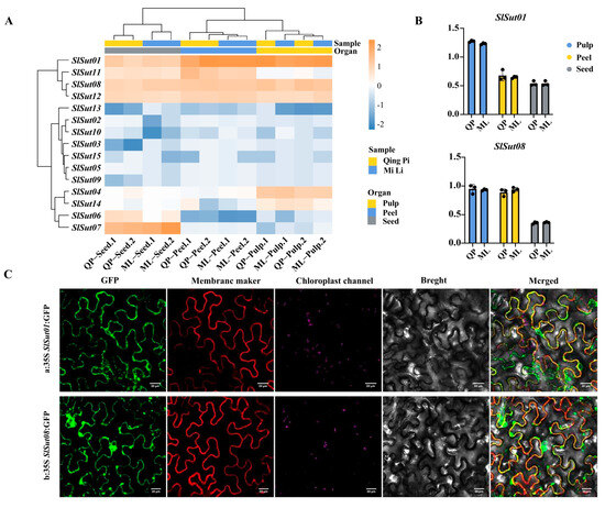 (A) Heatmap indicating the expression levels of SUTs in the pulp, peels, and seeds of QingPi (QP) and MiLi (ML). (B) qRT-PCR-based expression of SlSut01 and 08 in these organs. (C) Fluorescent microscopic images of SlSut01 and 08 in tobacco leaves. a, 35S:SlSut01:GFP; b, 35S:SlSut08:GFP.