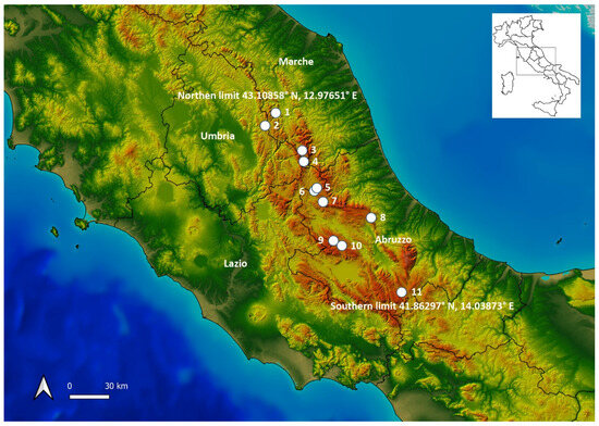 Investigated area. Sampled sites are indicated with dots: 1—Montelago, 2—Colfiorito, 3—Pian Perduto, 4—Pian Piccolo, 5 and 6—Campotosto, 7—Vomano River springs, 8—Voltigno, 9—Campo Felice, 10—Campo di Rovere, and 11—Cinque Miglia. Map source by [41].