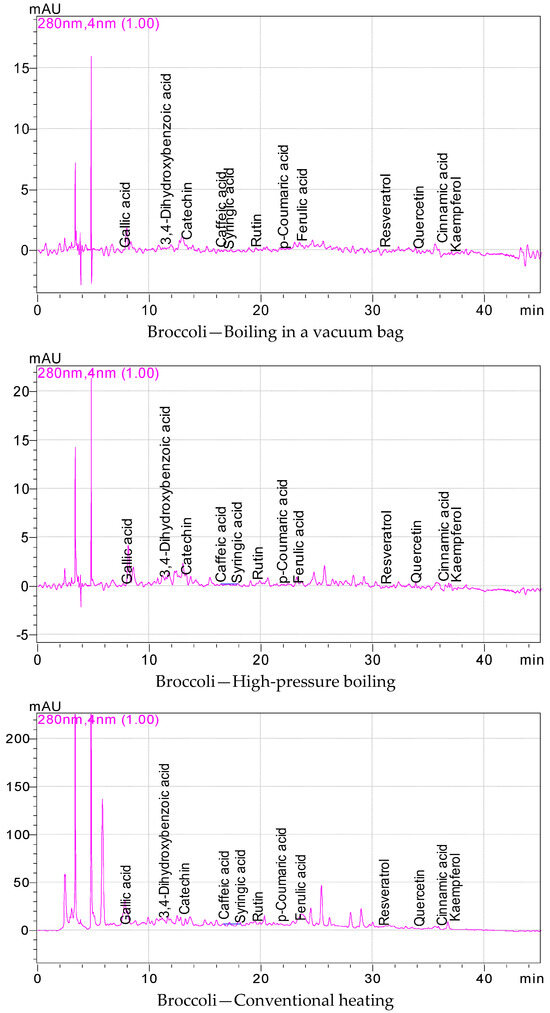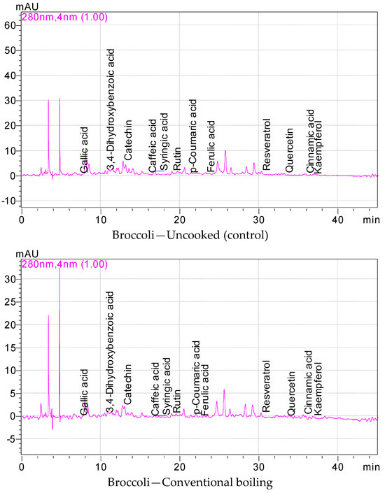 The phenolic profiles and their quantitative results of fresh and cooked broccoli samples are displayed in Table 2. Catechin, 3,4-dihydroxybenzoic acid, rutin, and gallic acid were the key phenolic compounds of fresh and cooked broccoli samples (Figure 1). It was observed that the phenolic components of broccoli were significantly affected by the applied cooking techniques. It was determined that the amount of phenolic components of cooked broccoli significantly decreased when compared to the fresh sample. However, the amounts of some phenolic profiles differed depending on the cooking technique. The phenolic components of broccoli samples cooked with conventional heating and microwave heating were higher when compared to the results of fresh broccoli and broccoli cooked using other cooking techniques. While the gallic acid quantities of broccoli florets varied between 0.52 (conventional boiling) and 4.29 mg/100 g (microwave heating), the 3,4-dihydroxybenzoic acid quantities of broccoli samples were assessed to be between 0.41 (conventional boiling) and 15.17 mg/100 g (microwave heating). In addition, the catechin and rutin quantities of fresh and cooked broccoli samples were assessed to be between 2.24 (conventional boiling) and 54.48 mg/100 g (microwave heating), and between 0.55 (conventional boiling) and 16.33 mg/100 g (microwave heating), respectively. The highest caffeic (7.07), syringic (6.21), p-coumaric acid (2.03), ferulic acid (4.72), resveratrol (1.11), quercetin (4.68), cinnamic acid (0.78), and kaempferol (5.12 mg/100 g) were found in broccoli cooked in the microwave. A significant part of the phenolic compounds in broccoli were adversely affected by conventional boiling, boiling in a vacuum bag, and high-pressure boiling methods. The catechin contents of broccoli cooked by means of boiling in a vacuum bag, high-pressure boiling, and conventional boiling were higher than broccoli cooked using conventional boiling. There were statistically significant changes among the phenolic compounds of broccoli cooked with different cooking methods (p < 0.05). Gunathilake et al. [46] pointed out that there is a decrease in total polyphenolic compounds during the cooking of some vegetables, and this decrease is probably due to the diffusion of polyphenolic compounds into boiling water. The effect of cooking methods on the release of phenolic constituents showed that heat treatments cause a partial hydrolysis of conjugated polyphenols. The release of polyphenols into free phenolic compounds triggered by heat treatment has been reported [23,35]. Caffeic acid, chlorogenic acid, and neochlorogenic acid were the major phenolic acids found in broccoli [45,47]. Fresh broccoli and broccoli cooked in the microwave contained 1.845 and 0.173 µg/g quercetin, 1.230 and 0.474 isorhamnetin, 4.976 and 7.252 trans-ferulic acid, 0.262 and 1.258 p-coumaric acid, and 52.158 and 46.489 µg/g chlorogenic acid, respectively [48]. Lopez-Hernandez et al. [40] reported that 0.27 mg/kg gallic acid, 16.43 chlorogenic acid, 0.97 caffeic acid, 10.89 isoquercitrin, 0.16 myricetin, 0.30 luteolin, and 0.12 quercetin were identified in raw broccoli. Also, 0.28–0.32 and 0.29–0.35 mg/kg gallic acid, 11.97–18.76 and 15.25–25.84 chlorogenic acid, 0.72–1.06 and 0.93–1.27 caffeic acid, 10.49–11.16 and 9.87–12.86 isoquercitrin, 0.14–0.18 and 0.14–0.18 myricetin, 0.31–0.37 and 0.39–15.01 luteolin, and 0.10–0.13 and 0.11–0.15 mg/kg quercetin were detected in broccoli cooked using MW and steaming, respectively [40]. In another study, adequate amounts of chlorogenic, neochlorogenic, and ferulic acids were detected in three broccoli samples (stem, leaf, and flower), while caffeic and p-coumaric acids were measured in broccoli leaf extracts. In addition, gallic acid and vanillic acid were detected in broccoli stems and flower extracts, while sinapic acid was detected only in broccoli leaves and flower extracts [49]. Our findings illustrated some fluctuations compared to the results of previous studies. These changes are likely due to broccoli variety, agricultural and climatic factors, harvest time, used parts, solvent types, extraction methods, and some other factors such as analytical conditions, storage, and cooking times and types.