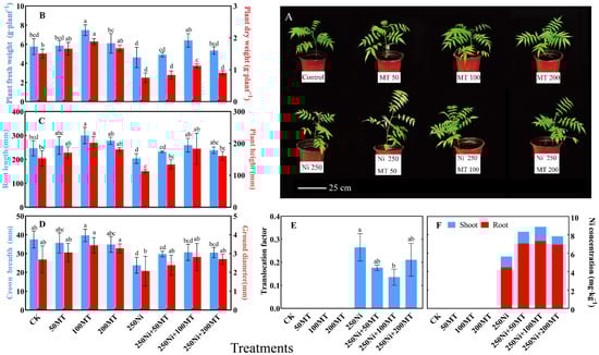 3.2. MT Enhanced the Ni Concentration of R. typhina and Reduced the Transport Factor