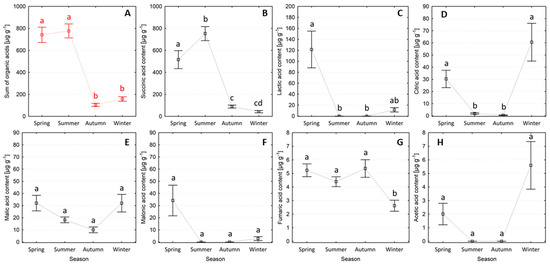 Organic acid content in Scots pine needles collected across four seasons (mean ± SE), where: (A) sum of organic acids, (B) succinic acid, (C) lactic acid, (D) citric acid, (E) malic acid, (F) malonic acid, (G) fumaric acid, (H) acetic acid. The same letters indicate no statistical differences in the sum of organic acid contents (red color) and individual acids between seasons (Kruskal–Wallis test, p < 0.05).