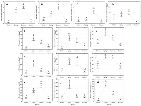 Phenolic compound contents in Scots pine needles collected across four seasons (mean ± SE), where: (A) 2,5-DHBA acid content, (B) caffeic acid, (C) coumaric acid, (D) protocatechuic acid, (E) ferulic acid, (F) t-cinnamic acid, (G) chlorogenic acid, (H) 4-HBA acid, (I) catechin acid, (J) gallic acid, (K) syringic acid, (L) vanillic acid, and (M) sinapic acid. The same letters indicate no statistical differences in the individual phenolic compounds between seasons (Kruskal–Wallis test, p < 0.05).