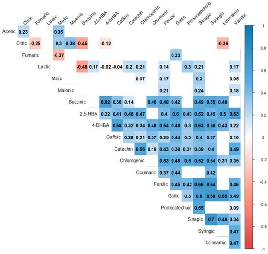 Spearman’s (non-parametric) correlation coefficient (r) matrix of the measured parameters (phenolic compounds and organic acids). Correlation coefficient values are shown in cells where the relationship is significant (p < 0.05). Blank cells represent no significant correlation. The corresponding color scale denotes positive (blue-colored tones) and negative (red-colored tones) correlation levels.