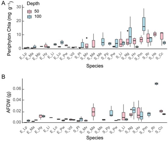 Boxplots of periphyton Chla (A) and ash free dry weight (AFDW, (B)) from macrophytes at 50 cm and 100 cm depth (n = 3–5). ‘E’ refers to emergent macrophytes; ‘S’ refers to submerged macrophytes. The species listed in the figure are indicated by the two initial letters of their species name. Lp stands for L. peploides subsp. stipulacea, Ma for M. aquaticum, Hy for H. vulgaris, Li for L. indica, Lo for L. ovalis, Pw for P. wrightii, Vd for V. denseserrulata, Pl for P. lucens, Mv for M. verticicillatum, Ms for M. spicatum, Pp for P. perfoliatu, Ls for L. sessiliflora, Mp for M. propinquum, Hs for H. salicifolia, Hv for H. verticillata, Ng for N. guadalupensis, Pm for P. maackianus, Po for P. octandrus, Rr for R. rotundifolia, and Cc for C. caroliniana. The middle line of the box plot represents the median; the upper and lower bars indicate the third quartile and first quartile, respectively. Dots outside the boxplot are outliers.