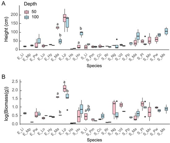 Boxplots of plant height (A) and biomass (B) of different macrophytes at 50 cm and 100 cm depth (n = 3~5). Boxplots show median, inter-quartile range, and minimum and maximum values. “a” and “b” refer to statical significance. The middle line of the box plot represents the median; the upper and lower bars indicate the third quartile and first quartile, respectively. Dots outside the boxplot are outliers.