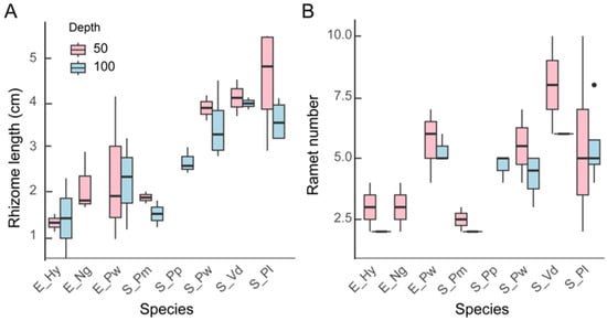Boxplots of rhizome length (A) and ramet number (B) of different macrophytes at 50 cm and 100 cm depth (n = 3~5). The description of the box whiskers is explained in Figure 1.