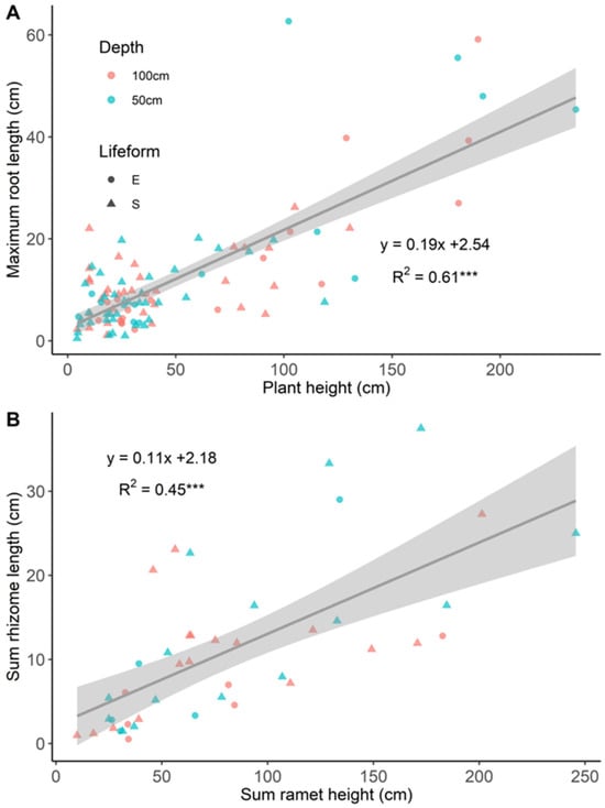 Plant height was positively related to maximum rhizome length (R2 = 0.25, p < 0.001). Similarly, a significant relationship was found between plant height and ramet numbers. Moreover, the higher the plants, the longer their roots (R2 = 0.61, p < 0.001) (Figure 4A); for instance, L. peploides subsp. stipulacea had the largest plant height (193.9 ± 20.7 cm) and root length (45.7 ± 11.6 cm).