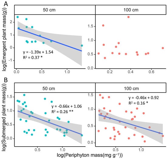 Scatter plots for the biomass of periphyton and emergent macrophytes (A) and submerged macrophytes (B) at 50 cm and 100 cm depth. Periphyton mass refers to periphyton Chla per macrophyte biomass. The axes were log-10 transformed. Lines fitted in the plots represent relationships between periphyton biomass and macrophyte biomass. * p < 0.05, ** p < 0.01. Green and orange refer to the 50 cm and 100 cm depth results, respectively.