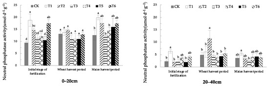 The observed diminution in soil neutral phosphatase activity as a function of increased soil depth was a consistent trend across all experimental treatments, indicating that the phosphatase level in the 20–40 cm soil layer is lower than the 0–20 cm soil layer.