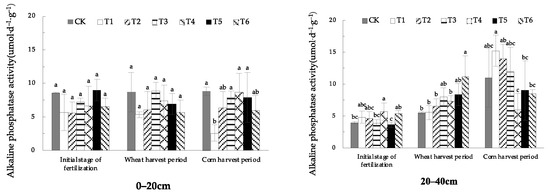 From the different soil levels, the alkaline phosphatase activity in the 20–40 cm soil was lower than that in the surface soil in the initial stage of fertilization and showed an increasing trend after the wheat-harvest period and the maize-harvest period, and was generally higher than that in the surface soil after the maize-harvest period, and the difference between treatments became larger.