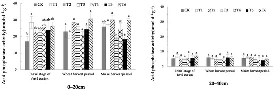Seen from Figure 3, in the initial stage of fertilization, the soil acid phosphatase activity of 0–20 cm soil treated with fulvic acid (T1) was significantly higher than that in CK. There was no significant difference between each treatment and CK in the wheat-harvest period and the maize-harvest period. The acid phosphatase activity of 20–40 cm soil did not change much and there was no significant difference among the treatments in the initial stage of fertilization, wheat-harvest period and maize-harvest period.