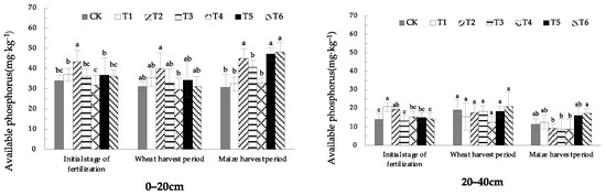 Figure 4 shows that in the 0–20 cm soil, the treatment of biochar (T2) was significantly higher than that in CK in the initial stage of fertilization, wheat-harvest period and maize-harvest period, showing better effective P fixation effect. The treatment of adding pig manure-vermicompost (T5) and cow manure-vermicompost (T6) significantly increased by 34.9% and 39.7%, respectively, compared with CK in the maize-harvest period. In general, the content of available P in the soil increased rapidly in the initial stage of fertilization. Compared with CK, EOM could activate the soil inherent P storage in short term and increase the available P content in the soil. During the wheat-harvest period, after eight months of transformation and the growth and absorption of a crop of wheat, the content of soil available P in each treatment decreased. There was no significant effect difference between the 0–20 cm and 20–40 cm soil layers after the treatment of high-energy microbial inoculum (T4) was applied to the soil, and the available P content in the soil was low.